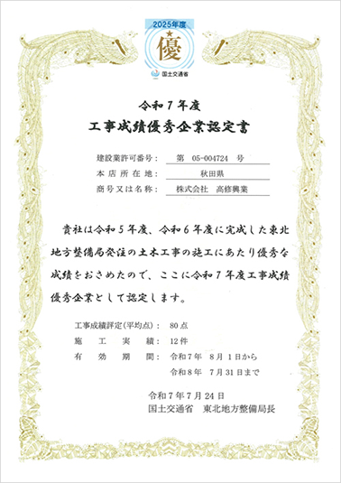 国土交通省 湯沢河川国道事務所表彰式 優良工事